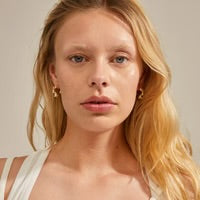 The earrings have an organically shaped design with a handcrafted feel, added with small white beads that give a cool and luxurious vibe to the small hoops. A set of earrings made from min. 75% recycled material with consideration for the environment.